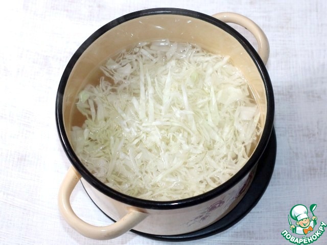 • 5. Нарезаем соломкой капусту и отвариваем в рыбном бульоне до полуготовности.