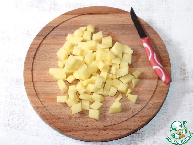 • 6. Кладем к капусте очищенный и порезанный кубиками картофель, варим до готовности.