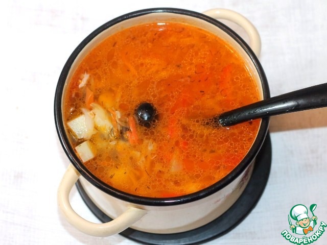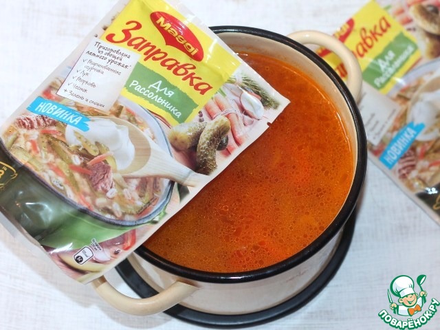 • 7. Затем добавляем в суп зажарку, маслины, заправку для рассольника MAGGI, солим, перчим и доводим на тихом огне до кипения.