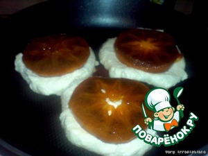 Пока тесто стоит, чистим хурму, режем кружочками, аккуратно освобождаем от косточек. У меня королек уже зрелый, косточки легко отходят. На разогретую с растительным маслом сковороду выкладываем три сырника и на каждый кружочек хурмы.