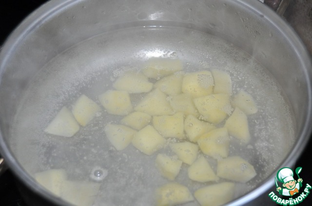 Картофель чистим, режем кубиками, кладём в воду, доводим до кипения и варим 10 минут на медленном огне при закрытой крышке. -