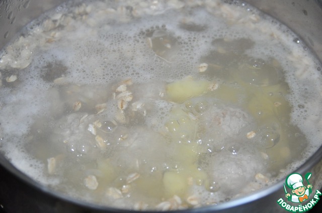 Через 10 минут с момента закипания картофеля, кладём в суп фрикадельки, доводим до кипения и варим 5 минут. Далее кладём овсяные хлопья, перемешиваем.