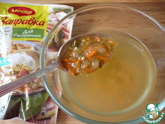 Отливаем несколько ложек бульона в миску и смешиваем с заправкой "Maggi" для рассольника.