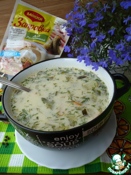 Это один из самых популярных традиционных польских супов. Этот суп низкокалорийный. Попробуйте приготовить к обеду польский суп с солеными огурцами и заправкой для рассольника "Maggi". Приготовление занимает совсем немного времени, в итоге получается вкусное и сытное первое блюдо, напоминающее рассольник.