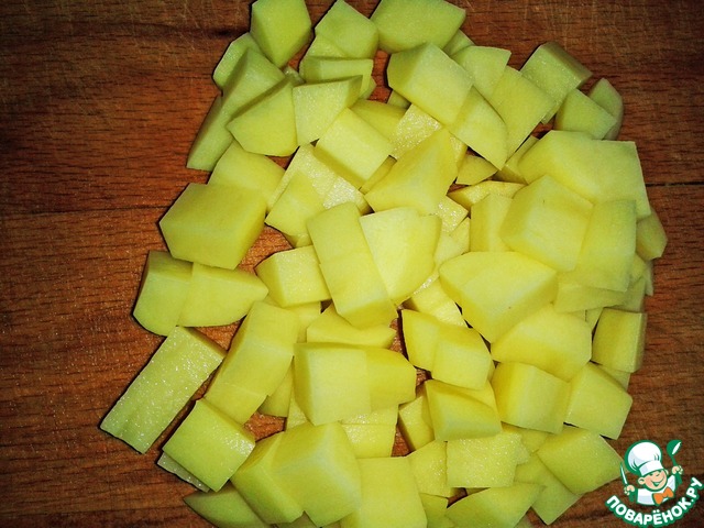 Пока варится рис, подготовим картофель. Чистим и нарезаем кубиками. Добавляем в кастрюлю с рисом.