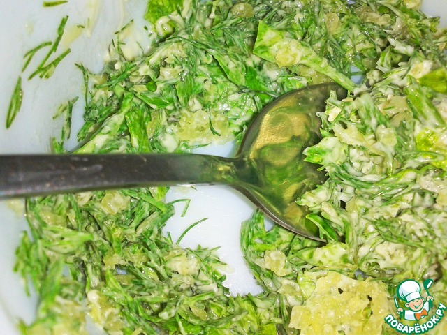 Подготавливаем зелень. Нарезаем укроп и петрушку, добавляем измельченный чеснок и ложку сливочного масла (комнатной температуры). Перемешиваем и добавляем в кастрюлю.