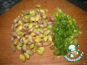 Добавляем фисташки и зеленый лук, перемешиваем.
