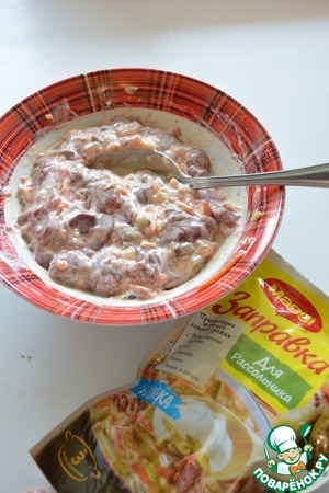 Добавьте к печени половину пакета заправки MAGGI для рассольника, сметану (или майонез), соль и перец по вкусу.