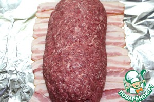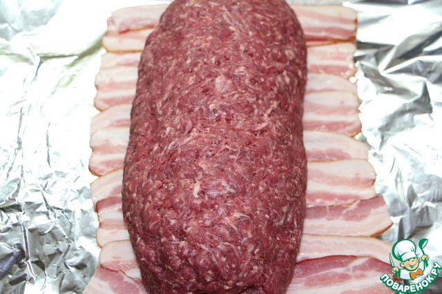 Выложить ломтики бекона внахлест, поверх бекона выложить рулет, обернуть рулет беконом.