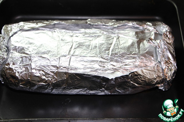 Завернуть плотно в фольгу, запекать при 200 градусах 1,5 часа