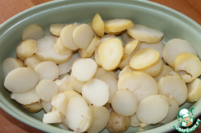 Тем временем в огнеупорную форму выложить картофель, нарезанный кружочками.