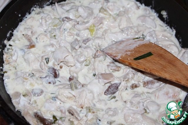 К курице с грибами добавить сливки или сметану, довести до кипения.