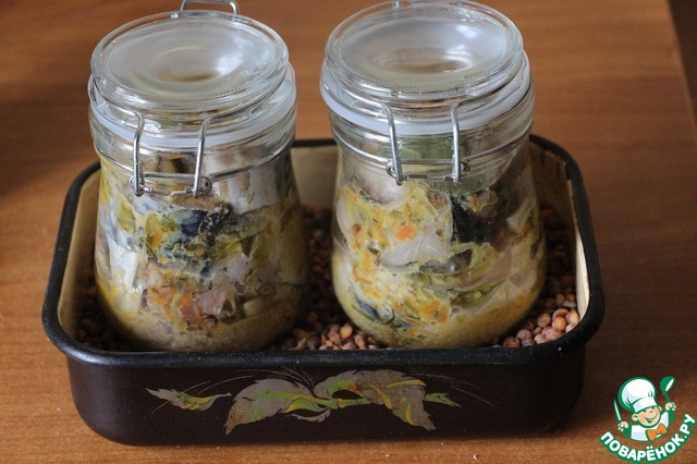 В противень насыпать горох (можно речной песок, соль или любую крупу), чтобы дно банки не лопнуло, и поставить на него банки. Ставим в холодную духовку, разогреваем ее до 130 градусов и забываем на 3 часа (только аппетитный аромат не даст нам забыть о них).