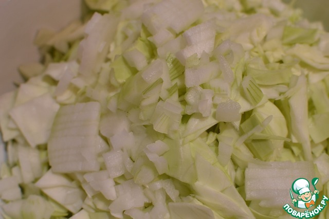 • Смешать капусту, лук, помидор, грибы, немного! посолить, поперчить по вкусу, все тщательно перемешать