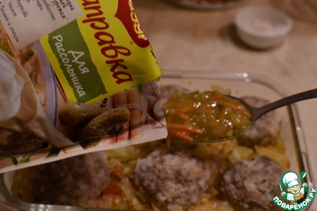 • По истечении часа капусту проверить, она должна быть готовой. Если капуста жестковата, то нужно довести до готовности. У меня капуста молодая и запеклась за час. Фольгу снимаем, равномерно распределяем заправку для рассольника "Магги" по капусте и тефтелям.