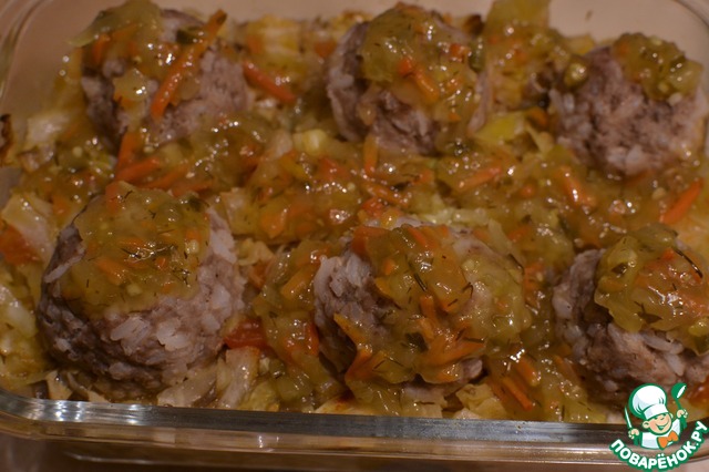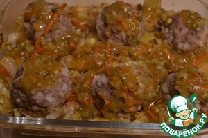 • Разогреть духовку до 220 гра. Выложить капусту в предварительно смазанную форму с высокими бортами. Перемешать фарш с отварным рисом, немного! посолить, сформировать тефтели и выложить поверх капусты.