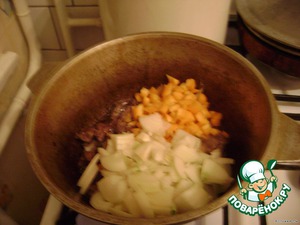 Моковь и лук режем кубиками, закидываем к мясу, обжариваем, уменьшаем огонь до минимума, накрываем крышкой и тушим 30-40 минут.