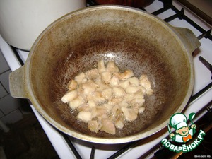 Курдюк порезать на небольшие кусочки. Сбросить в разогретый казан и хорошо поджарить.