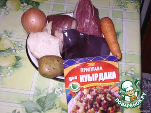 Приправа для куырдака: мускатный орех, имбирь, чёрный перец, чили, базилик, лук. паприка, тмин, чеснок, соль йодированная(переписала с пачки приправы)
