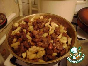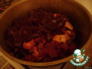 Седце и печень нарезаем кусочками как мясо, закидываем в казан.