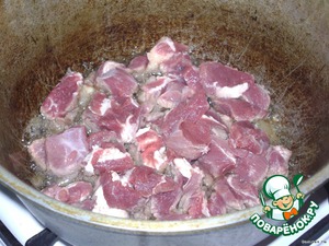 Мясо (или лёгкое, или и то и другое) порезать чуть крупнее курдюка, сбросить в казан, обжарить.