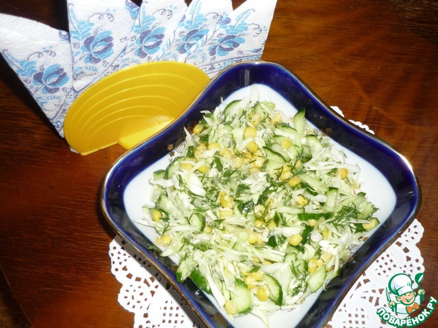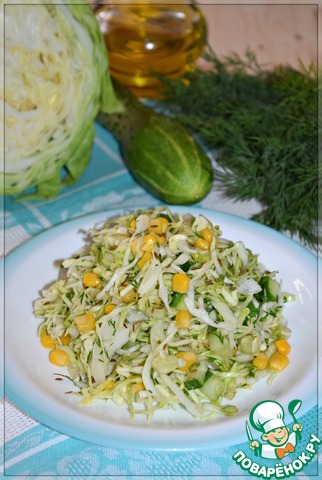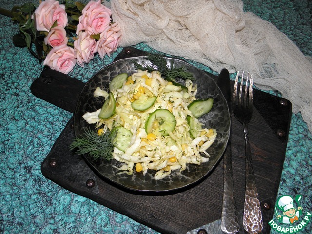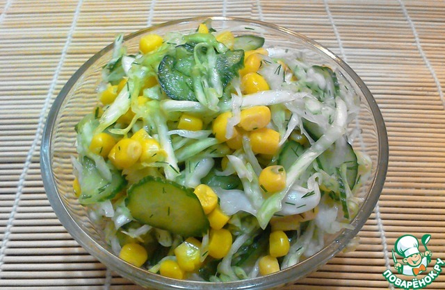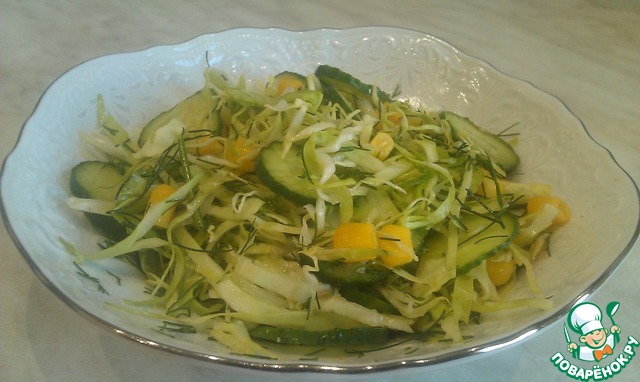 Вроде понятный и знакомый состав салата, но пряные и ароматные специи делают салат совершенно интересным и не избитым. Сладкая кукуруза как нельзя кстати дополняет свежую и хрустящую капустку. Такой салат не стыдно и на праздничный стол подать, да и повседневное и постное меню приятно разнообразит. Угощайтесь!