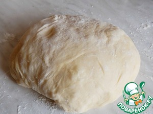 • Тесто раскатать в круг толщиной около 1см и выложить на противень, (или в круглую форму) застеленный пекарскрй бумагой и смазанный маслом. В формк можно сделать бортики.