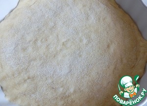 Тесто раскатать в круг толщиной около 1см и выложить на противень, (или в круглую форму) застеленный пекарскрй бумагой и смазанный маслом. В формк можно сделать бортики.
