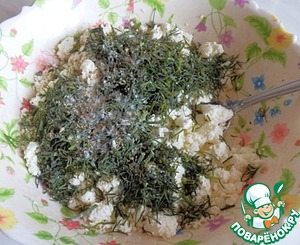 • Готовим начинку. Зелень мелко порезать и смешать с творогом, добавить соль и черный молотый перец (или специи по вкусу).