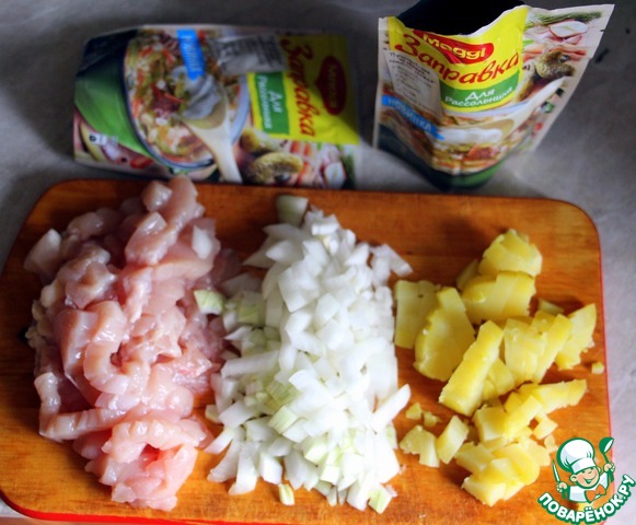 Для начинки мелко нарезать грудку, лук и отварной картофель.