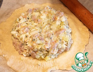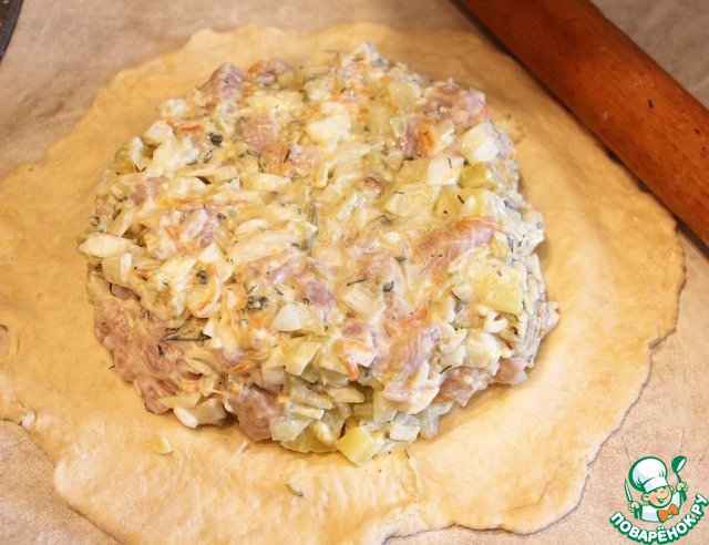 Большую часть теста раскатать. На середину выложить с горкой нашу начинку, оставляя края теста.