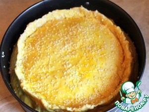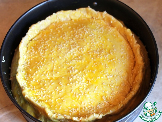 Меньшую часть теста раскатать, положить сверху и защипнуть с нижним слоем теста. Смазать желтком и посыпать кунжутом.