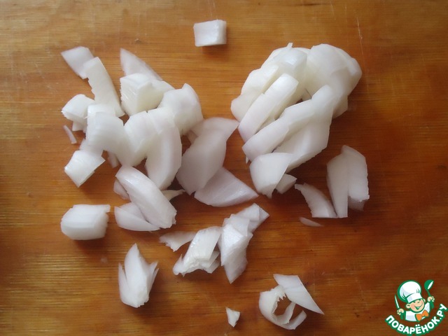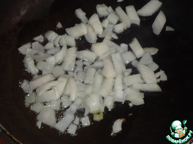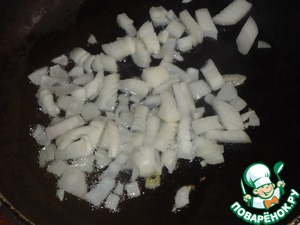 Пережарить лук до прозрачного цвета на разогретой сковороде с маслом.