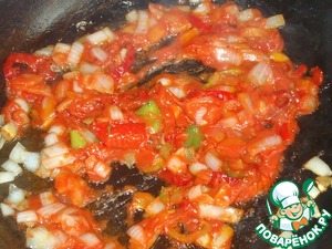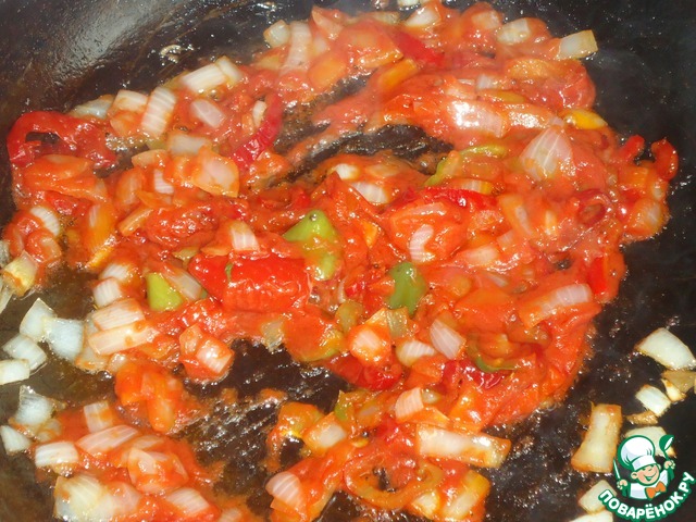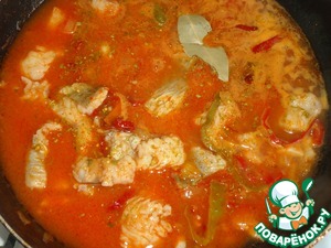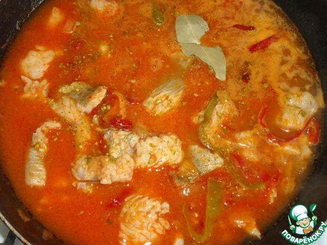 После чего добавить рыбное филе, перемешать и влить воду, сахар щепотку (по желанию), тушить на медленном огне 20 минут, за 10 минут до готовности добавить лавровый лист и специи.