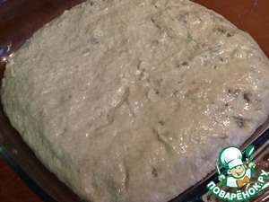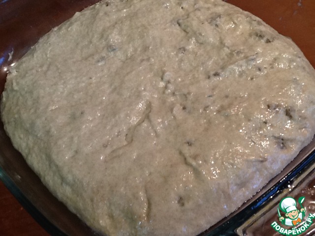 • Собственно тесто готово! Выкладываем половину (у меня получилось 630 г теста, а значит выкладываю 315 г или чуть больше вниз) в смазанную форму для выпекания. У меня 25*25 - она чуть большевата для этого пирога. 20*20 будет идеально. Делаем лопаточкой бортики небольшие.