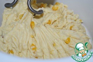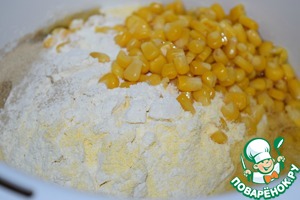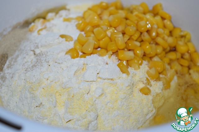 Оба вида муки просеять. С кукурузы слить лишнюю жидкость. Вместо консервированной кукурузы можно использовать замороженную.