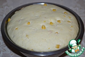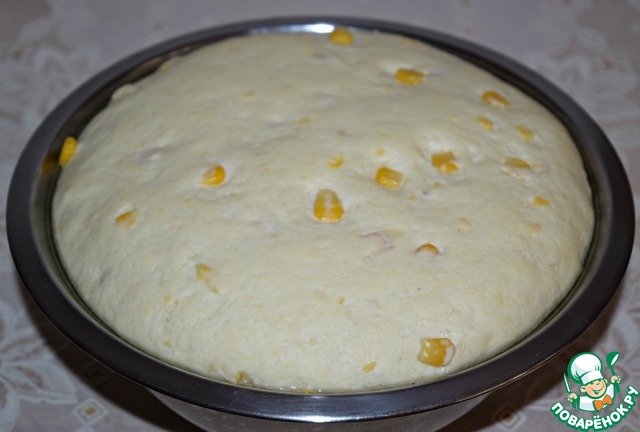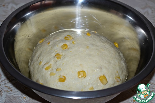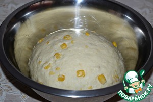 Выложить тесто в чашку, смазанную кукурузным (подсолнечным маслом), затянуть пищевой пленкой и поставить для подхода в теплое место на 40-45 минут.