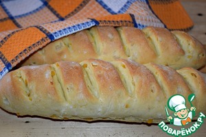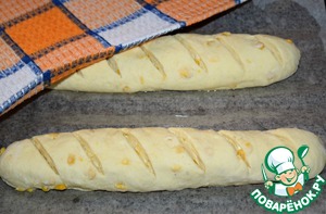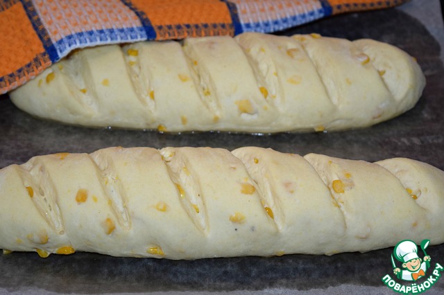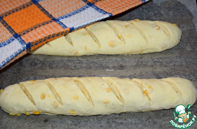 Выложить батоны на противень, застеленный пергаментом. Пергамент смазать маслом. Сделать на заготовках надрезы. Прикрыть полотенцем и поставить на расстойку в теплое место минут на 20-25.