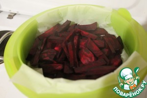 Свеклу и морковь вымоем, очистим. Нарежем брусочками. Свеклу отправим в пароварку на 15-20 минут. Чуть присолим. Я выстлала свою силиконовую пароварку пергаментом, чтобы свекла не окрасила дно.