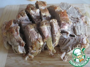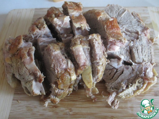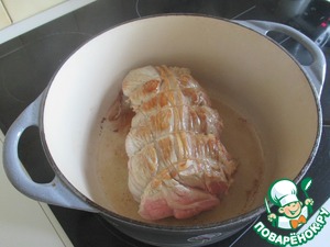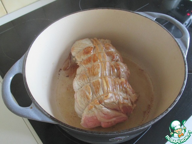 Духовой шкаф разогреть до 150 гр, поместить в него мясо в огнеупорной посуде под крышкой или фольгой на 1-1,5 часа. -