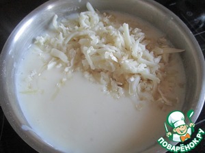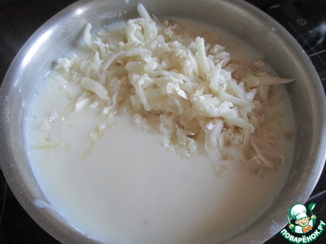 Постепенно добавляя молоко к муке и постоянно помешивая венчиком, сварить соус бешамель (как не густая сметана), посолить и поперчить по вкусу. Добавить тертый сыр (125 гр), перемешать и снять с огня.