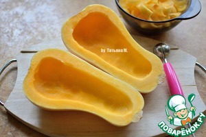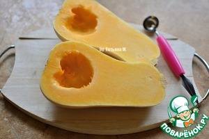Вынуть мякоть тыквы, образуя "лодочку" из нее;
