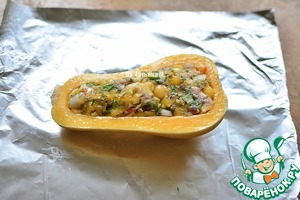Вложить начинку плотно в "лодочки" из тыквы, чуть смазать верх маслом;