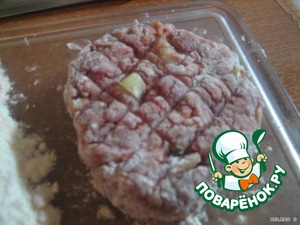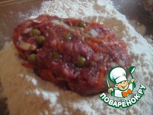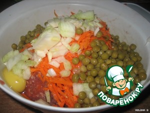 В фарш добавляется измельчённый лук, тёртая морковь, горошек, яйцо, зелень и вегетта.