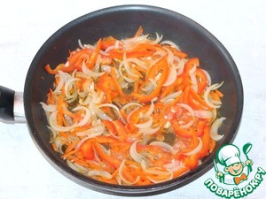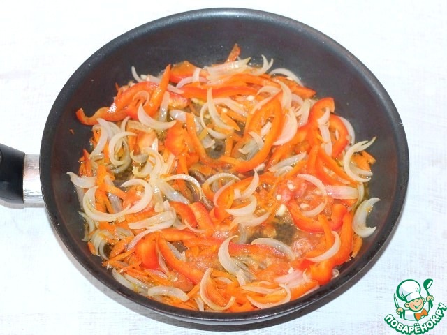 6. К пассеровке добавить порезанный соломкой сладкий перец и очищенный от шкурки, и мелко порезанный помидор. Тушить под крышкой от 2-3 минут.