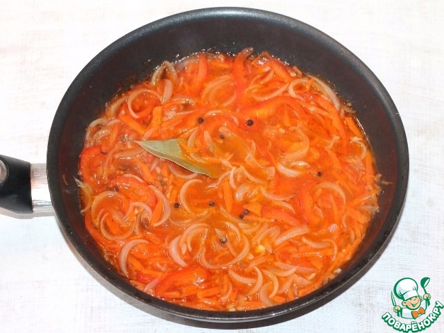 8... кетчуп, бульон, измельченную дольку чеснока, перец горошком, лавровый лист, посолить и тушить 2-3 минуты.