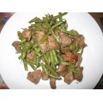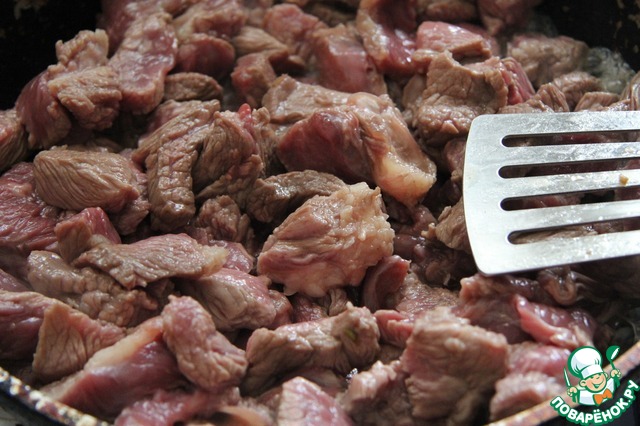Выложить нарезанное брусочками мясо и зарумянить со всех сторон
