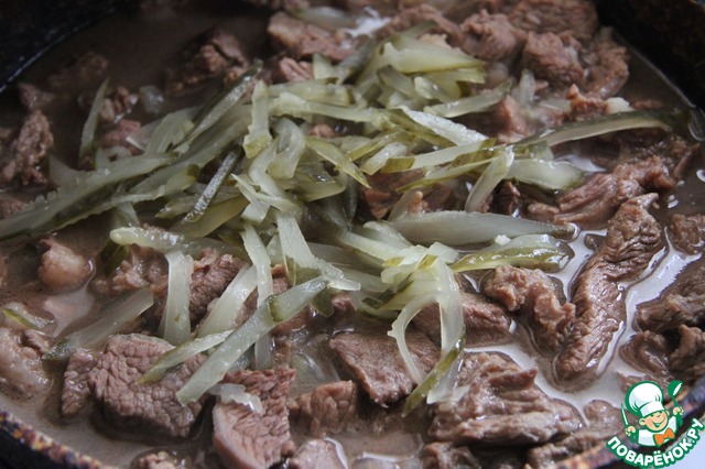 Добавить нарезанные тонкой соломкой соленые огурцы и потушить около 5 - 10 минут.