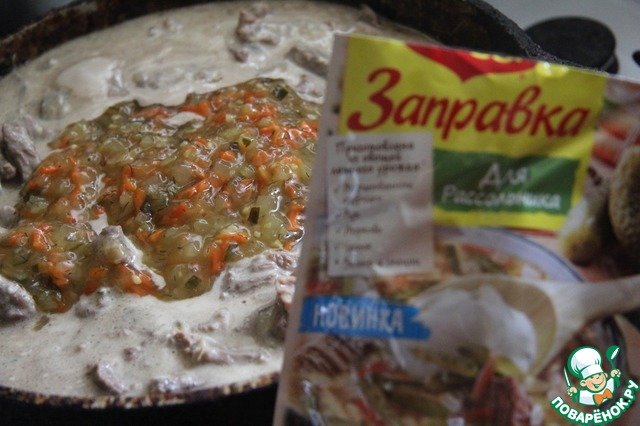 Тонкой струйкой вылить соус в мясо, добавить готовую заправку Магги для рассольника. Все перемешать, посолить. Потушить 5 минут.