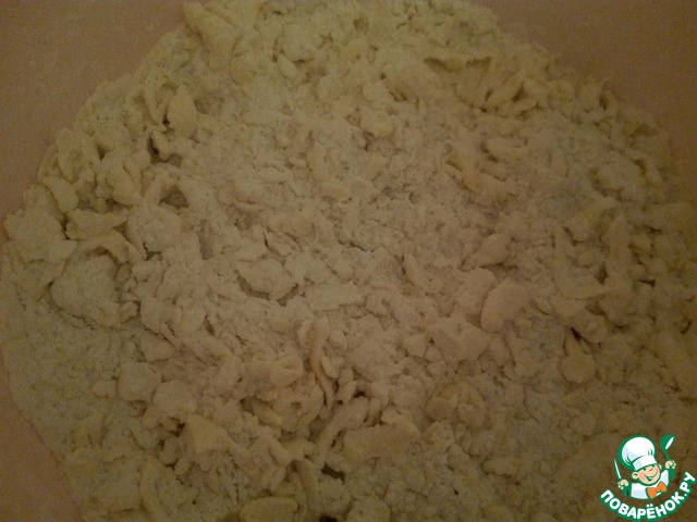 1. Просейте муку. Смешайте все сухие ингредиенты. Натрите сливочное масло на крупной терке. Аккуратно перемешайте.